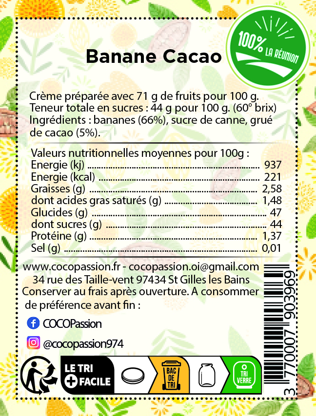 Crème de Banane Cacao préparée avec 58,5% de fruits pour 100g.