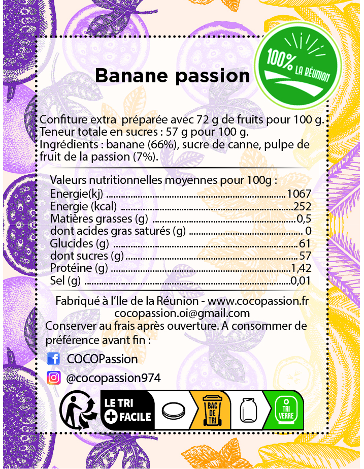 Découvrez notre délicieuse confiture extra de banane aux fruits de la passion, élaborée à partir de bananes mûries à point sur l’île ensoleillée de La Réunion et associées à l’intensité aromatique du fruit de la passion.