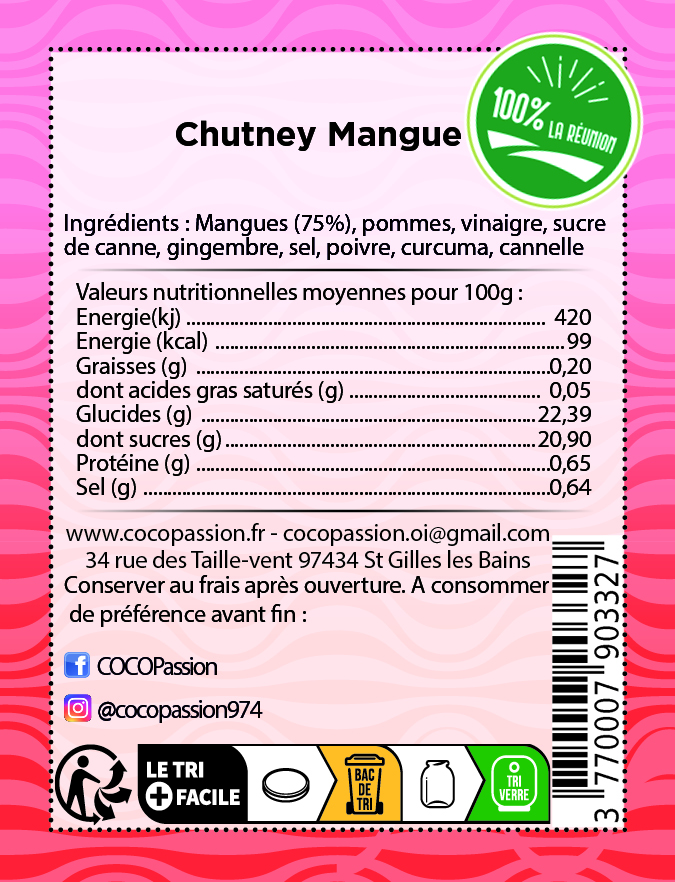 Chutney de Mangue préparé avec : Mangues (75%), pommes, vinaigre, sucre de canne, gingembre, sel, poivre, curcuma, cannelle .