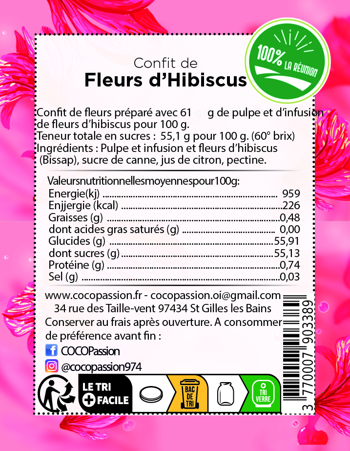 Notre confit de Fleurs d’Hibiscus Bissap est préparée avec 60g de fruits pour 100g .