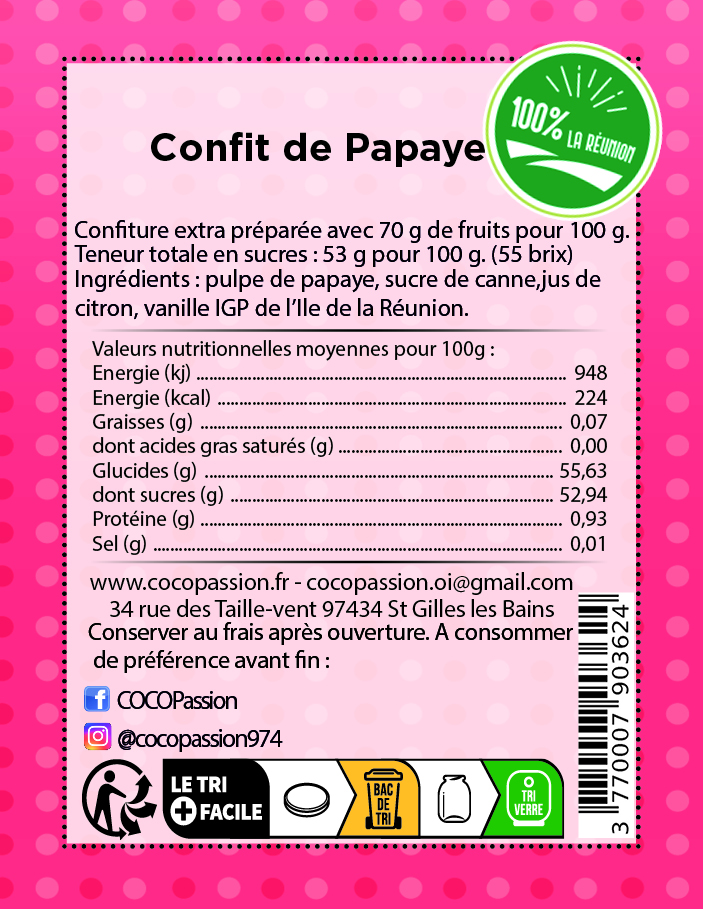 Notre confit de papaye est préparé avec 70g de fruits pour 100g. Ingrédients : Pulpe de Papaye, sucre de canne, jus de citron, vanille Bio de l’ile de la Réunion.