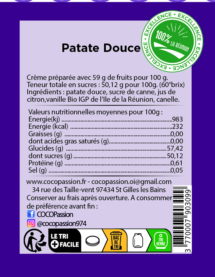 Ingrédients : patate douce, sucre de canne, jus de citron, vanille Bio de l’ile de La Réunion .