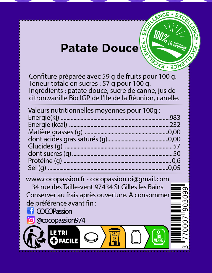 Ingrédients : patate douce, sucre de canne, jus de citron, vanille Bio de l’ile de La Réunion .