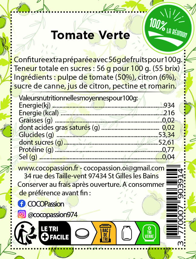 Découvrez notre savoureuse confiture extra artisanale de tomates vertes : une préparation réalisée à partir de tomates fraichement cueillies à l’ile de La Réunion