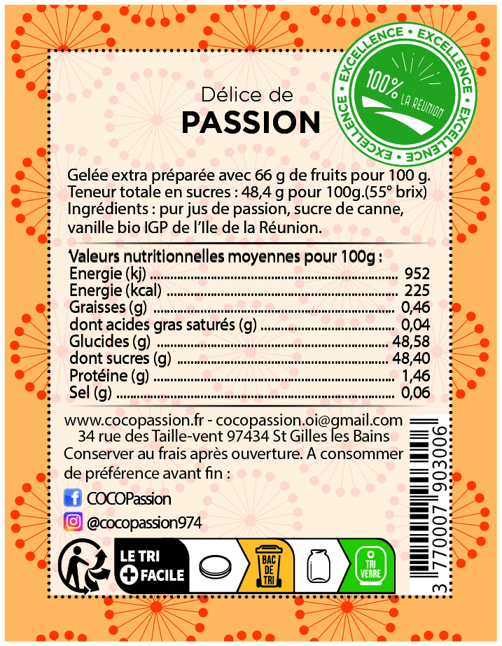 Ingrédients : pulpe de fruit de la Passion, sucre de canne, jus de citron, vanille IGP bio de l’Ile de la Réunion
