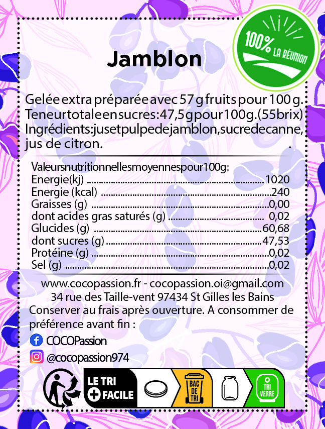 La Gelée de Jamblon est une délicieuse préparation artisanale qui met en valeur le fruit exotique du jamblon. Ce petit fruit, de la taille d’une olive, possède une saveur unique qui rappelle celle de la mûre, avec un parfum floral subtil. Le jamblon évoque de précieux souvenirs d’antan pour les réunionnais, qui se souviennet des pieds de jamblon dans les cours d’école, aujourd’hui disparus, mais qui apportaient une touche sucrée et fruitée aux moments d’enfance.